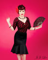 This entire top is trimmed in delicate sheer ruffle elastic trim and finished with a black velvet bow at the centre front.
